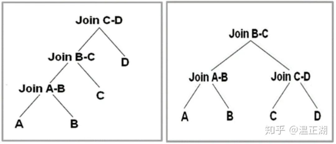 这样可以充分利用CPU资源,减少IO资源消耗。但事情往往是两面的,MPP并不完美,主要问题包括: 基于上述分析,MPP比较适合执行时间不会太久的业务场景,比如数小时。因为时间越久,故障概率越大。 4、其他非MPP架构 基于MR系统局限性考虑,除了采用MPP架构外,Hive和Spark均使用不同方式进行了优化,包括Hive的Tez,SparkSQL基于DAG(Directed Acyclic Graph)等。 不同架构有不同优缺点,重要的是找到其适用的场景,并进行靠谱地优化,充分发挥其优势。 什么是基于代价的查询优化? 有了适合的系统架构并不一定能够带来正向收益,“好马配好鞍”,执行计划的好坏对最终系统的性能也有着决定性作用。执行计划及其优化,就笔者的理解来说,其来源于关系型数据库领域。这又是一门大学问,这里仅简单介绍。 分布式架构使得执行计划能够进行跨节点的并行优化,通过任务粒度拆分、串行变并行等方式大大缩短执行时间。除此之外,还有2个更重要的优化方式,就是传统的基于规则优化以及更高级的基于代价优化。 基于规则优化 通俗来说,基于规则的优化(rule based optimization,RBO)指的是不需要额外的信息,通过用户下发的SQL语句进行的优化,主要通过改下SQL,比如SQL子句的前后执行顺序等。比较常见的优化包括谓语下推、字段过滤下推、常量折叠、索引选择、Join优化等等。 谓语下推,即PredicatePushDown,最常见的就是where条件等,举MySQL为例,MySQL Server层在获取InnoDB表数据时,将Where条件下推到InnoDB存储引擎,InnoDB过滤where条件,仅返回符合条件的数据。在有数据分区场景下,谓语下推更有效; 字段过滤下推,即ProjectionPushDown,比如某个SQL仅需返回表记录中某个列的值,那么在列存模式下,只需读取对应列的数据,在行存模式下,可以选择某个索引进行索引覆盖查询,这也是索引选择优化的一种场景; 常量或函数折叠也是一种常见的优化方式,将SQL语句中的某些常量计算(加减乘除、取整等)在执行计划优化阶段就做掉; Join优化有很多方法,这里说的基于规则优化,主要指的是Join的实现方式,比如最傻瓜式的Join实现就是老老实实得读取参与Join的2张表的每条记录进行Join条件比对。而最普遍的优化方式就是Hash Join,显然效率很高。不要认为这是想当然应该有的功能,其实MySQL直到8.0版本才具备。另外Join的顺序及合并,有部分也可以直接通过SQL来进行判断和选择。 基于代价优化 基于规则的优化器简单,易于实现,通过内置的一组规则来决定如何执行查询计划。与之相对的是基于代价优化(cost based optimization,CBO)。 CBO的实现依赖于详细可靠的统计信息,比如每个列的最大值、最小值、平均值、区分度、记录数、列总和,表大小分区信息,以及列的直方图等元数据信息。 CBO的一大用途是在Join场景,决定Join的执行方式和Join的顺序。这里所说的Join我们主要是讨论Hash Join。 根据参与Join的驱动表(Build Table)和被驱动表(Probe Table)的大小,Hash Join一般可分为broadcast和partition两种。 广播方式适用于大表与小表进行Join,在并行Join时,将小表广播到大表分区数据所在的各个执行节点,分别与大表分区数据进行Join,最后返回Join结果并汇总。 而分区方式是最为一般的模式,适用于大表间Join或表大小未知场景。分别将两表进行分区,每个分区分别进行Join。 显然,判断大小表的关键就看是否能够通过某种方式获取表的记录数,如果存储层保存了记录数,那么可从元数据中直接获取。 如果Join的两表都是大表,但至少有个表是带Where过滤条件的,那么在决定走分区方式前还可进一步看满足条件的记录数,这时候,物理上进行分区的表存储方式可发挥作用,可以看每个分区的最大值和最小值及其记录数来估算过滤后的总记录数。当然,还有种更精确的方式是列直方图,能够直接而直观得获取总记录数。 如果上述的统计信息都没有,要使用CBO还有另一种方式就是进行记录的动态采样来决定走那种Join方式。 如果一个查询的SQL中存在多层Join操作,如何决定Join的顺序对性能有很大影响。这块也已是被数据库大佬们充分研究过的技术。 一个好的CBO应该能够根据SQL 语句的特点,来自动选择使用Left-deep tree(LDT,左图)还是 bushy tree(BYT,右图)执行join。 两种Join顺序没有好坏之分,关键看进行Join的表数据即Join的字段特点。 对于LDT,如果每次Join均能够过滤掉大量数据,那么从资源消耗来看,显然是更优的。对于给每个列都构建了索引的某些系统,使用LDT相比BYT更好。 一般来说,选择BYT是效率更高的模式,通过串行多层Join改为并行的更少层次Join,可以发挥MPP架构的优势,尽快得到结果,在多表模式ROLAP场景常采用。 为什么需要向量化执行引擎?其与动态代码生成有何关系? 查询执行引擎 (query execution engine) 是数据库中的一个核心组件,用于将查询计划转换为物理计划,并对其求值返回结果。查询执行引擎对系统性能影响很大,在一项针对Impala和Hive的对比时发现,Hive在某些简单查询上(TPC-H Query 1)也比Impala慢主要是因为Hive运行时完全处于CPU bound的状态中,磁盘IO只有20%,而Impala的IO至少在85%。 什么原因导致这么大的差别呢?首先得简单说下火山模型的执行引擎。 火山模型及其缺点 火山模型(Volcano-style execution)是最早的查询执行引擎,也叫做迭代模型 (iterator model),或 one-tuple-at-a-time。在这种模型中,查询计划是一个由operator组成的DAG,其中每一个operator 包含三个函数:open,n