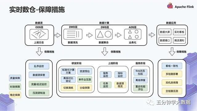 我们先看蓝色部分的质量保障。针对质量保障,可以看到在数据源阶段,做了如数据源的乱序监控,这是我们基于自己的 SDK 的采集做的,以及数据源和离线的一致性校准。研发阶段的计算过程有三个阶段,分别是研发阶段、上线阶段和服务阶段。研发阶段可能会提供一个标准化的模型,基于这个模型会有一些 Benchmark,并且做离线的比对验证,保证质量是一致的;上线阶段更多的是服务监控和指标监控;在服务阶段,如果出现一些异常情况,先做 Flink 状态拉起,如果出现了一些不符合预期的场景,我们会做离线的整体数据修复。