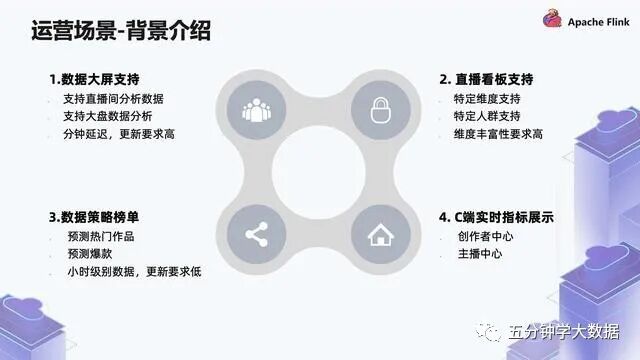 第一个是数据大屏支持,包括单直播间的分析数据和大盘的分析数据,需要做到分钟级延迟,更新要求比较高;