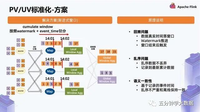 Watermark 推进过了窗口的 event_time,它会进行一次下发的触发,通过这种方式可以解决回溯的问题,数据本身落在真实的窗口, Watermark 推进,在窗口结束后触发。此外,这种方式在一定程度上能够解决乱序的问题。比如它的乱序数据本身是一个不丢弃的状态,会记录到最新的累计数据。最后是语义一致性,它会基于事件时间,在乱序不严重的情况下,和离线计算出来的结果一致性是相当高的。以上是 PV/UV 一个标准化的解决方案。