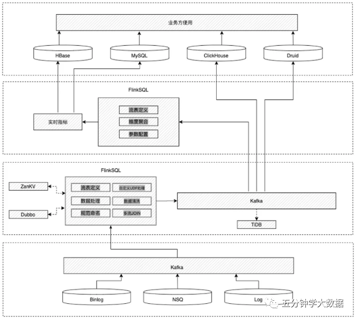 realtime_dwm_trip_trd_pas_bus_accum_1min该层主要的工作是把实时汇总数据写入应用系统的数据库中,包括用于大屏显示和实时 OLAP 的 Druid 数据库(该数据库除了写入应用数据,也可以写入明细数据完成汇总指标的计算)中,用于实时数据接口服务的 Hbase 数据库,用于实时数据产品的 mysql 或者 redis 数据库中。