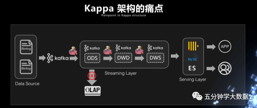 首先,在构建实时业务场景时,会用到 Kappa 去构建一个近实时的场景,但如果想对数仓中间层例如 ODS 层做一些简单的 OLAP 分析或者进一步的数据处理时,如将数据写到 DWD 层的 Kafka,则需要另外接入 Flink。同时,当需要从 DWD 层的 Kafka 把数据再导入到 Clickhouse,Elasticsearch,MySQL 或者是 Hive 里面做进一步的分析时,显然就增加了整个架构的复杂性。