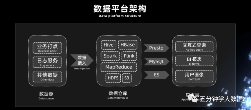 在数仓体系中会有各种各样的大数据组件,譬如 Hive/HBase/HDFS/S3,计算引擎如 MapReduce、Spark、Flink,根据不同的需求,用户会构建大数据存储和处理平台,数据在平台经过处理和分析,结果数据会保存到 MySQL、Elasticsearch 等支持快速查询的关系型、非关系型数据库中,接下来应用层就可以基于这些数据进行 BI 报表开发、用户画像,或基于 Presto 这种 OLAP 工具进行交互式查询等。
