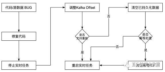 实时任务一旦上线就要求持续不断的提供准确、稳定的服务。区别于离线任务按天调度,如果离线任务出现 Bug,会有充足的时间去修复。如果实时任务出现 Bug,必须按照提前制定好的流程,严格按照步骤执行,否则极易出现问题。造成 Bug 的情况有非常多,比如代码 Bug、异常数据 Bug、实时集群 Bug,如下图展示了修复实时任务 Bug 并恢复数据的流程。