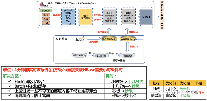 首先看一下基础明细层 (图中左方),数据源有两条链路,其中一条链路是消费的流,比如直播的消费信息,还有观看 / 点赞 / 评论。经过一轮基础清洗,然后做维度管理。上游的这些维度信息来源于 Kafka,Kafka 写入了一些内容的维度,放到了 KV 存储里边,包括一些用户的维度。