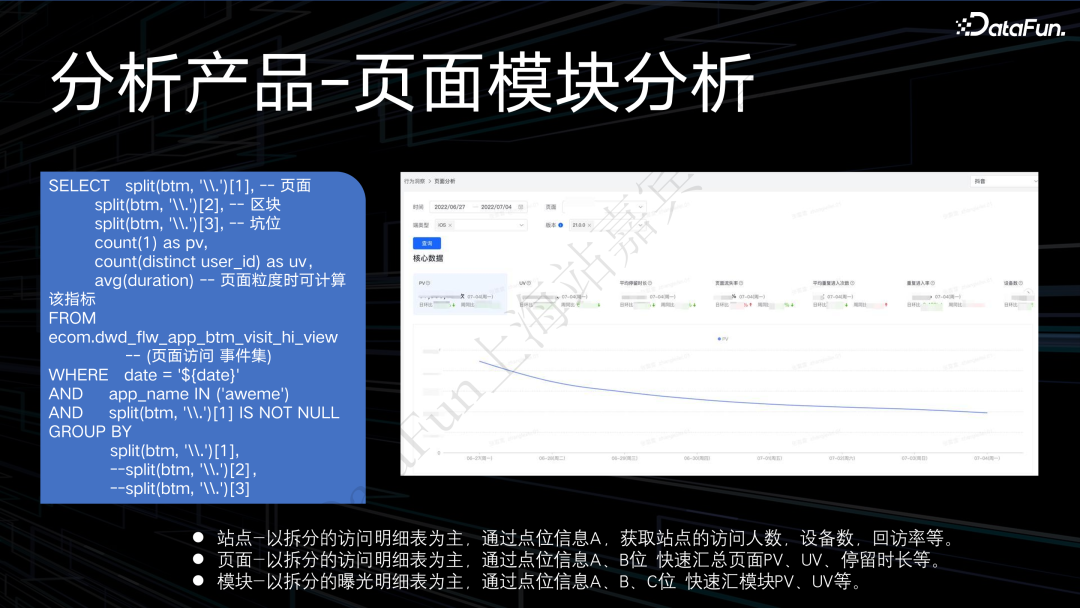 以下将提供一段代码示例来说明“如何基于新规则提供低操作成本的分析能力”。该示例类似于访问事件集,可以根据这个访问事件集和 BTM 的命名信息(页面、区块、坑位),加工出一个模块的效果数据,包括 PV 数据、UV 数据、停留时长数据和页面流失率等。![]()