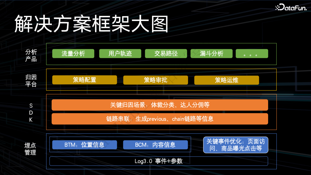 - 解决方案框架的底层主要是管理埋点,并通过 BTM 和 BCM 的定义来建立规范,确保相关信息的透出能够得到充分约束,还会针对一些关键事件,如页面访问和商品曝光点击信息等进行优化,然后将其输出到 SDK 中。