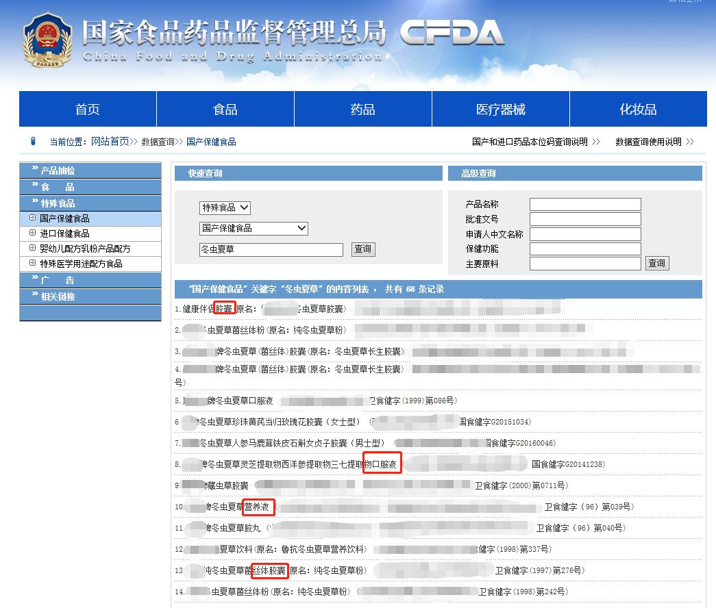 在国家食品药品监督管理总局的“国产保健品”类目下搜索冬虫夏草,全部都是冬虫夏草提取物所制成的胶囊、营养液等,而仅以冬虫夏草原材料作为保健品的产品,则不在其列。