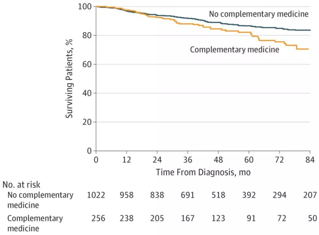 对于肿瘤患者使用非常规疗法后,所导致的生存率差异,国际肿瘤学顶级期刊《美国医学会杂志•肿瘤学》(JAMA Oncology)在线发表的一篇论文,结果如下: