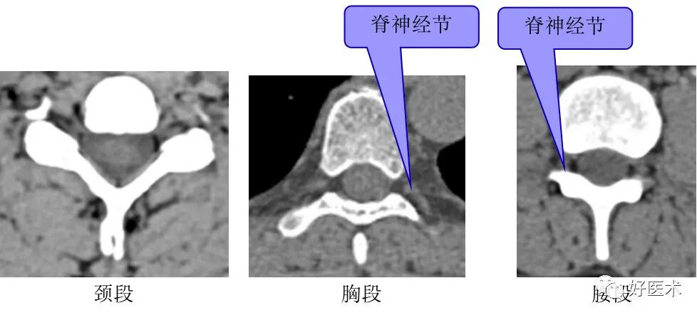 椎间孔:位于椎管前外侧,其内的脊神经根呈软组织密度,周围有低密度的脂肪组织环绕