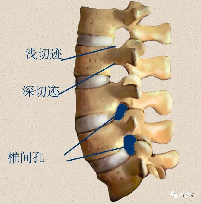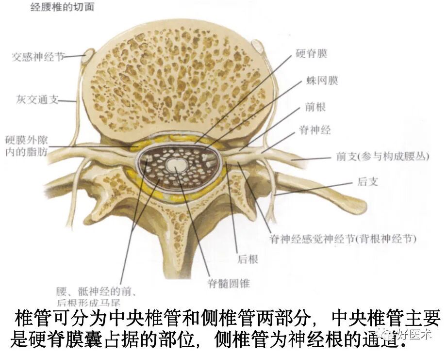 主要特征:椎管呈不完整的骨性环,其断开处为椎间孔下部,不同部位椎间孔下部经过的结构不同,颈段主要为脊神经根,胸腰段主要为椎间静脉。