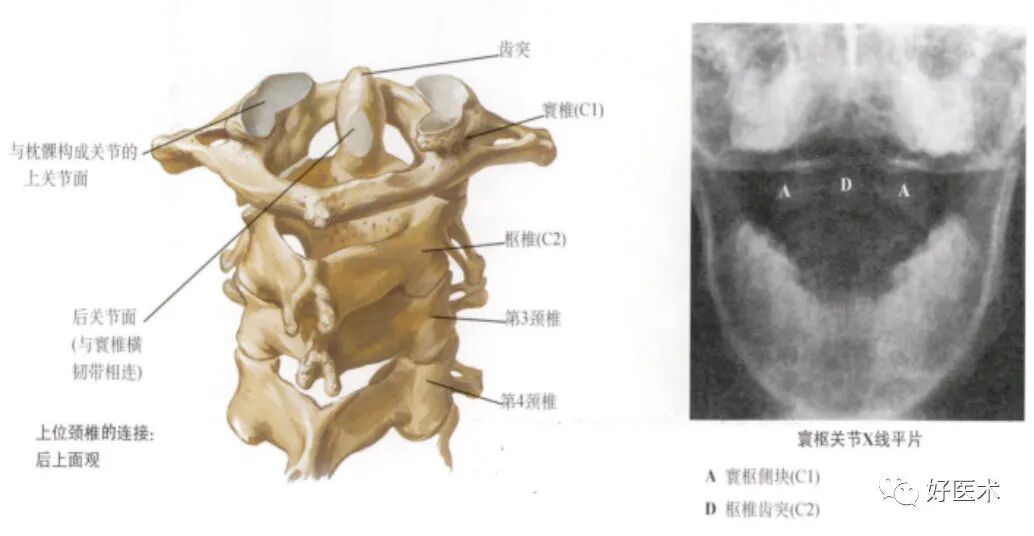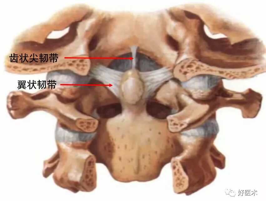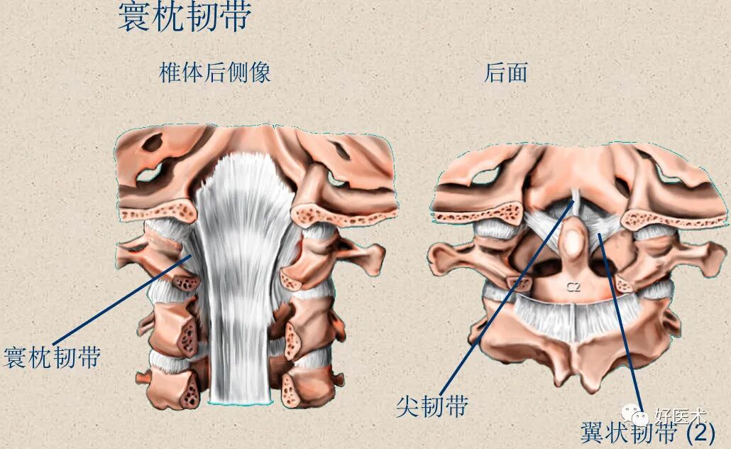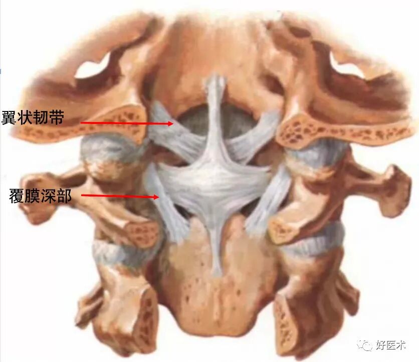 寰枢关节稳固性的结构:关节囊、寰枢前膜、寰枢后膜、覆膜、寰椎十字韧带、齿突尖韧带、翼状韧带等。