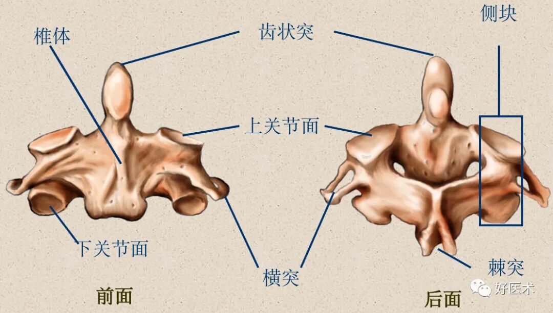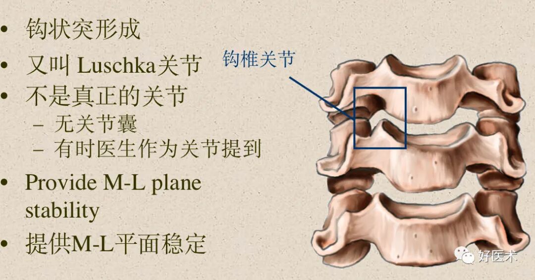 3~7颈椎椎体上面外侧缘的椎体钩与相邻椎体形成钩椎关节,增加颈椎稳定性,防止上一颈椎及椎间盘移位。