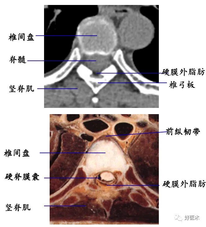 硬脊膜囊:呈圆形或椭圆形软组织密度影。CT平扫不能区别硬脊膜囊、脑脊液和脊髓。