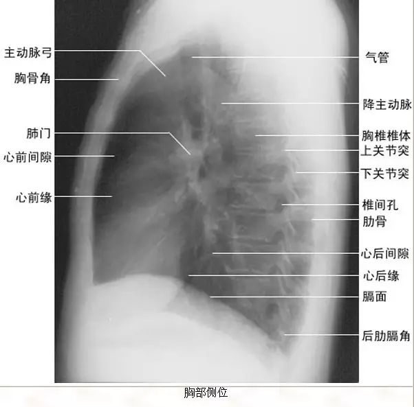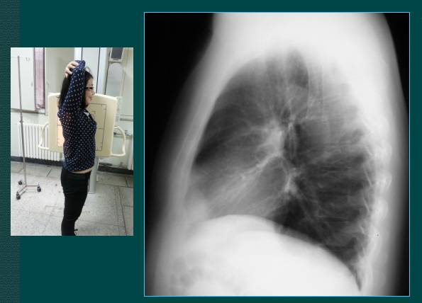 上图是胸部侧位片的拍摄,一般采取右侧位拍片,如果看心脏影可以采取左侧位片。