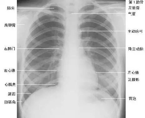 临床拍标准的胸部正位片其实是后前位片,如上图。