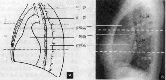 纵隔的分区对确定纵隔病变的部位和分析病变性贡有重要意义。一般采用九分区法,即在侧位胸片上将纵隔划分为前、中、后及上、中、下共九个区。