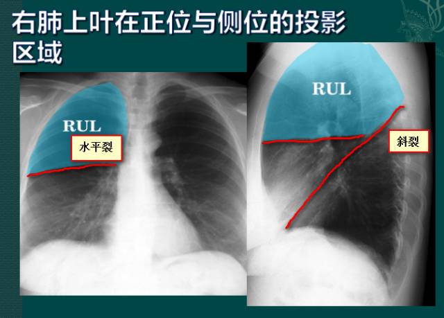上图为:右肺上叶在正位与侧位的投影区域
