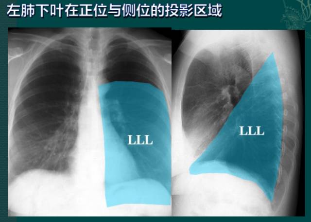 上图为:左肺下叶在正位与侧位的投影区域