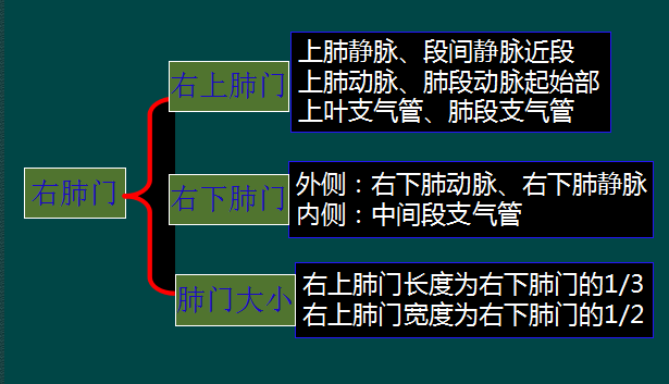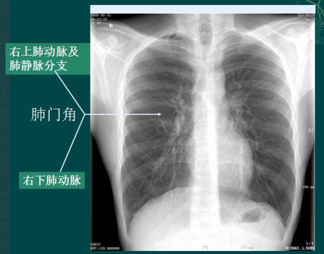 右肺门可分为上、下两部。上部约占1/3,由上肺静脉、上肺动脉及下肺动脉后回归支构成。上肺静脉下后干构成右上肺门的外缘;右肺门下部 约占2/3,由右下肺动脉干构成,其正常宽度不超过15mm,沿中间段支气管外缘平行向外下走行。右肺门上、下部相交形成一钝的夹角,称肺门角,正常该角顶清晰。如下图