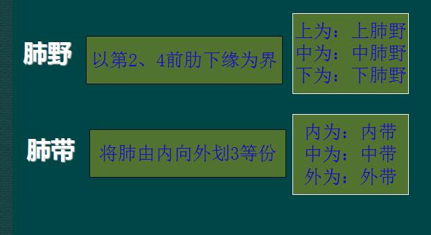 为便于指明病变的部位,通常人为地将一侧肺野纵向分为三等分,即内、中、外带。又分别在两侧第2、4肋骨前端下缘划一水平线,将肺野横向分为上、中、下三个肺野。(如上图)。
