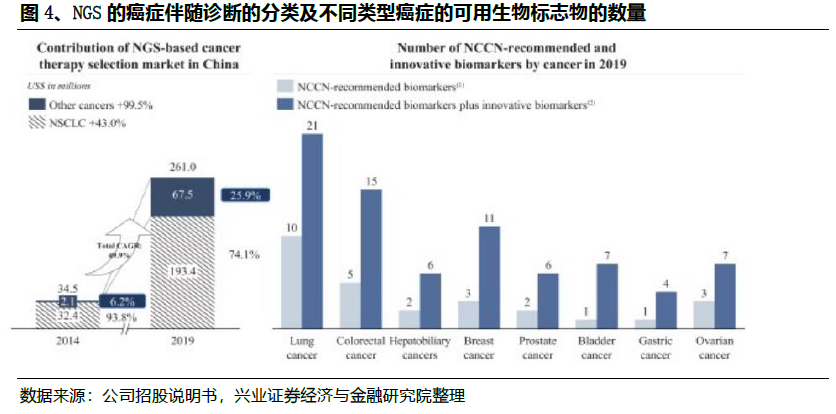 1.1.3 中国癌症药物可及性:政府已采取多种方式提高可及性,但与美国相比仍有差距中国已经采取了多项措施来推进癌症治疗和控制癌症治疗费用,包括建立20个省级癌症中心,以提高癌症的预防和治疗。中国建立了癌症登记系统,截至2019年2月,全国共有574家癌症登记机构,覆盖4.38亿人。此外,在与制药公司进行价格谈判后,中国将于2019年将8种抗癌药物列入国家医保目录(“NDRL”),并大幅降价。此外,中国在药品审批制方面采取了快速通道,让更多国产新药、创新药和进口药对中国患者可及。中国还设立了临床试验专项审批渠道,如果没有向申请人提出询问或反馈负面意见,之前审批时间需要2-3年,但目前只需60天。随着新型抗癌药物的普及,精准肿瘤学的应用,尤其是癌症分子谱的应用将会进一步提高。但目前癌症诊断和治疗方面与美国相比仍有差距。2019年,靶向治疗和免疫治疗占中国各类癌症治疗收入的26.7%,明显低于美国的85.6%,而靶向治疗和免疫治疗可以避免化疗的严重副作用,并可能取得更好的治疗效果,有望成为中国癌症治疗市场新的治疗标准。因此,癌症基因分型,即识别与患者癌症相关的特定基因组改变和生物标记,在中国正被越来越多地采用,因为它为医生利用靶向治疗和免疫治疗制定个性化治疗计划提供了宝贵的帮助。1.2、NGS肿瘤基因检测在市场中的应用范围:四大应用范围先进快速测序技术的引入、生物信息学领域的进步、政府政策的扶持、不断提高的可负担性以及中国精准医疗意识的增强,推动了肿瘤基因检测行业的市场增长。肿瘤基因检测主要应用可以分为三个部分,包括(1)伴随诊断,评估患者基因组谱,帮助治疗选择;(2)早期筛查,识别特定的分子标志物,使癌症在高危人群中早期发现;(3)分子残留病检验,服务于治疗后的癌症患者,作为癌症复发的预防检测方法;(4)开发服务,主要包括与生物制药公司、医院和研究机构合作开发新的试验和治疗方法。1.2.1、癌症伴随诊断产品市场:市场潜力巨大,几大成长动力共同驱动1)在中国伴随诊断的规模:2030年规模将达45亿美元与传统的癌症基因分型方法不同,NGS癌症伴随诊断可以在一次单一检测中同时检测到与患者癌症相关的所有基因组改变和生物标志物,显著降低了成本,同时提高了准确性。目前针对各类癌种的相关标志物和靶向以及免疫治疗的种类已经比较丰富。![]()