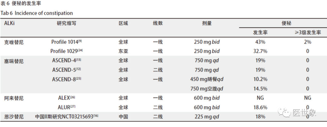 便秘是ALKi的常见不良反应,总体发生率较高,在10.2%-43%,但基本均是1级-2级不良反应。
