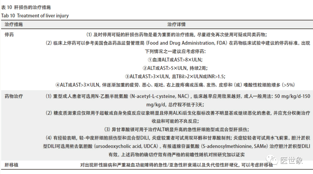 不同ALKi药物的肝损伤不良反应剂量调整也可参考药物说明书推荐,如塞瑞替尼建议:当ALT或AST>5×ULN、总胆红素<2倍正常值时,应当停止用药,直到ALT/AST恢复到基线或者<3倍正常值时,由150 mg剂量慢慢恢复到正常量。当ALT或AST>3×ULN、总胆红素>2×ULN(不存在胆汁淤积或溶血)时,应终止用药。
