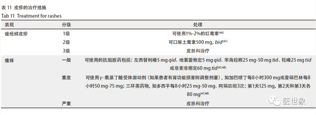 对于重度不良反应,应系统用药改善症状,必要时减量或暂停抗肿瘤靶向治疗,待皮疹改善后考虑是否调整抗癌方案(表11)。
