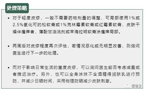皮疹是靶向药常见的不良反应之一,一般发生于服用靶向药后的两周内,但多数患者症状较轻,多表现为痤疮样皮疹、皮肤脱屑、皮肤干燥瘙痒等。