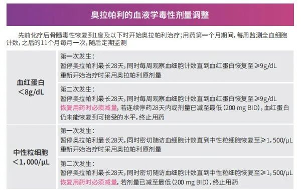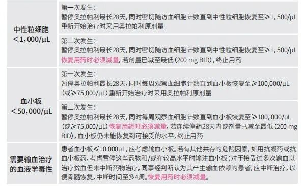 如果中断治疗28天以内,血液学毒性没有恢复,停用尼拉帕利,并且转诊至血液科专家处进行进一步评估