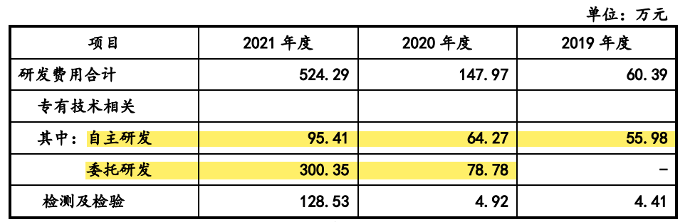以研发投入最高的2021年为例,其中检测和检验费用128.53万,占研发费用的24.5%;而用于自主研发的费用仅95.41万,占比仅18%;委托研发的费用为300.35万。