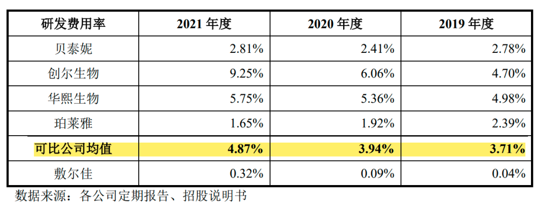 比如,2021年,研发投入占比较高的华熙生物达5.75%,创尔生物更是接近10%,同样曾经委托生产为主的贝泰妮占比也有2.81%。而同年,敷尔佳的研发投入占比不及可比公司均值4.87%的零头。