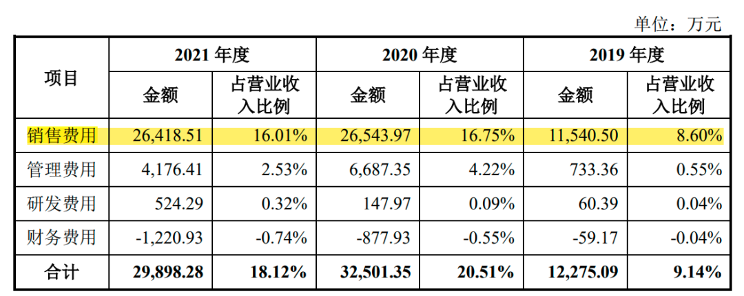 2019—2021年,敷尔佳的销售费用分别为1.15亿元、2.65亿元、2.64亿元,销售费用率分别为8.60%、16.75%及16.01%。