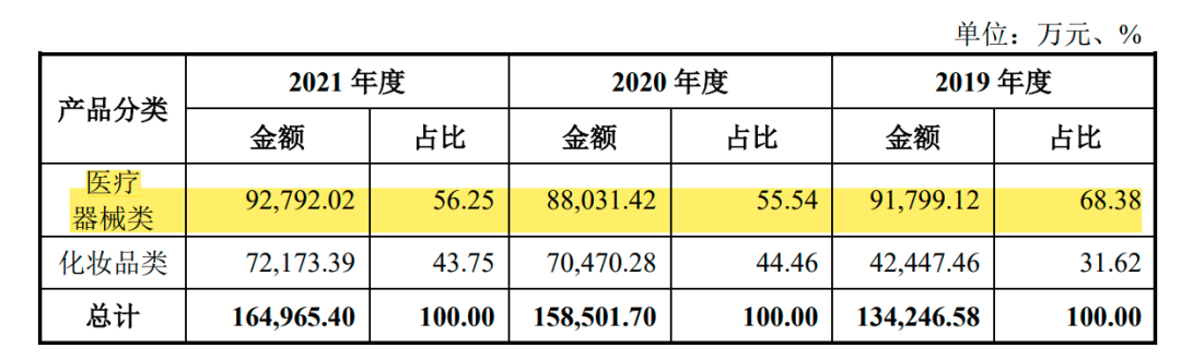 从收入占比来看,医疗器械类产品占据了敷尔佳收入的半壁江山,2019—2021年,占总收入的比例分别为68.38%、55.54%和56.25%;化妆品类近3年的占比有所提高,到2021年底占比4成多。