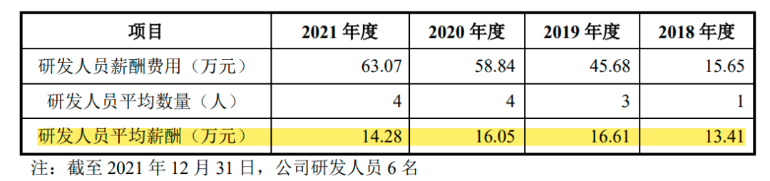 再比如,研发投入最高占比不超过营收的0.4%,研发人员仅6人,2021年实现营收16.5亿元。