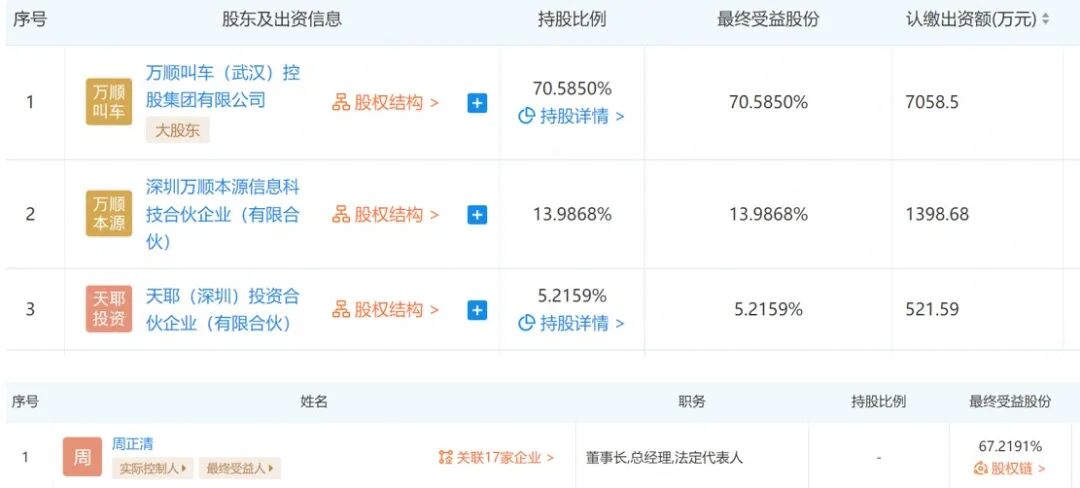 据企查查显示,万顺叫车主体为深圳万顺叫车云信息技术有限公司,法定代表周正清,大股东为万顺叫车(武汉)控股有限公司,持股比例70.585%。