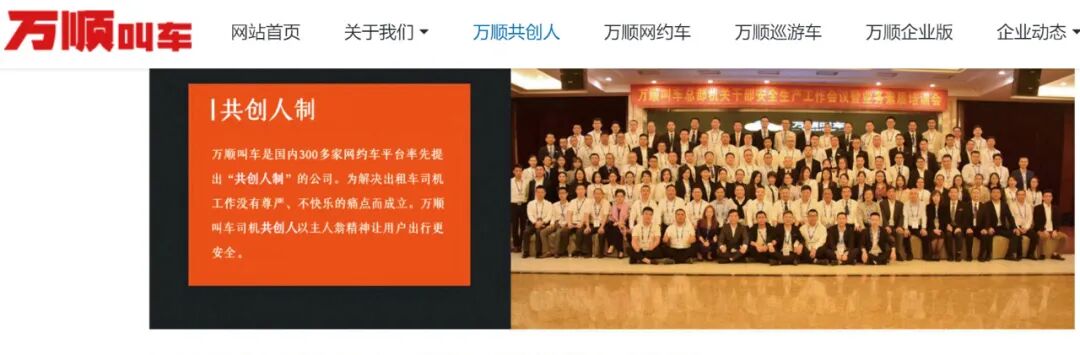 在官网上,万顺叫车将其“共创人”放在醒目位置。并称“是国内200多家网约车平台率先提出‘共创人制’的公司”。