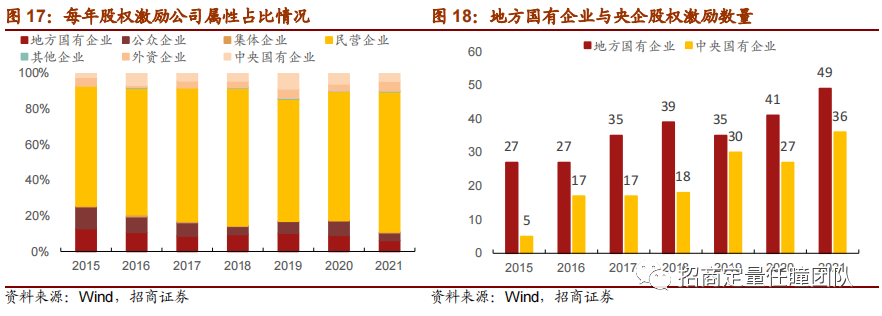 从下图可以看到,民营企业一直都是我国实施股权激励的“主力军”,平均每年占股权激励公司数量的70%以上。而从图4中可以看到,近几年伴随着国有企业改革,每年发布股权激励预案的国有企业数量也在不断增多。去年5月,国资委发布《中央企业控股上市公司实施股权激励工作指引》对央企上市公司发布股权激励给出了明确、具体的工作指引和实施标准。因此,我们认为在未来国企央企股权激励会越来越“常态化”,不断激发国企央企发展内在动力。