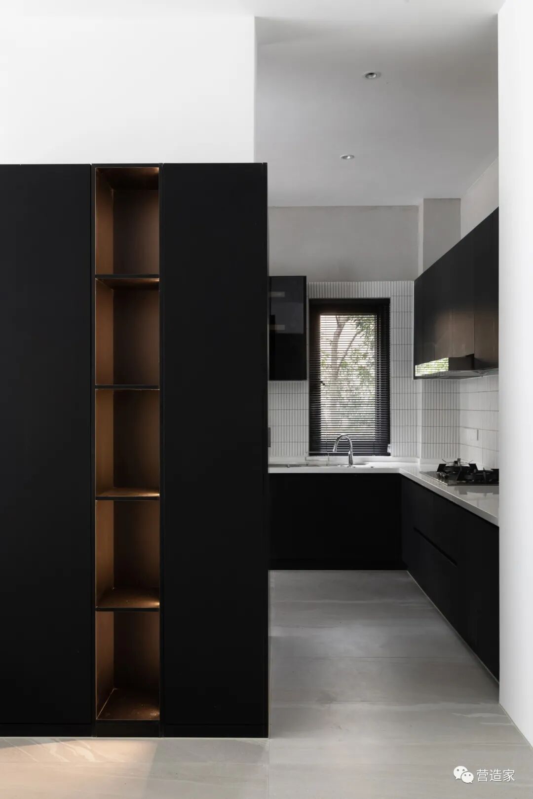 ,嵌合厨房储物和功能,削弱了立柱的存在感,使得厨房动线更流畅合理。运用构成设计的手法,通过调整窗户和柜体之间的比例、材质、肌理,赋予空间更多的细节。