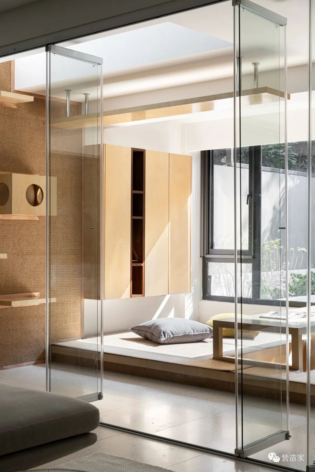 完全向客厅开放的茶室和猫屋,像一个透明的容器,在开放和封闭之间切换,空间的开合和聚拢满足了不同的使用场景。