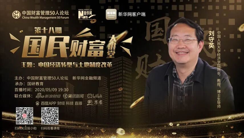 5月9日(周六)晚7:30,中国人民大学经济学院院长、教授、博士生导师刘守英做客《国民财富大讲堂》第十八期节目。他将围绕“中国经济转型与土地制度改革”主题,分享中国经济转型与土地制度的发展进程、疫情中的土地与房地产概况、转型阶段特征下的土地制度改革、以及土地要素市场化改革等问题。