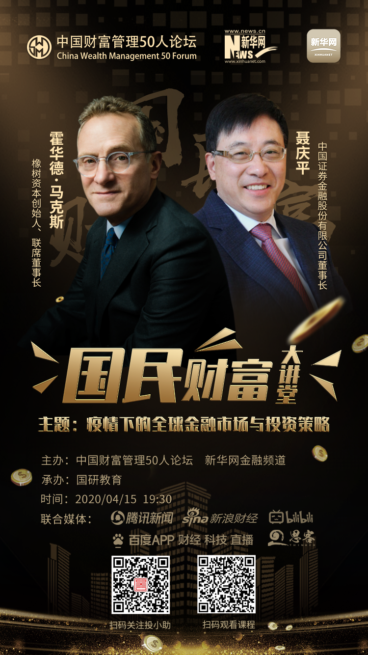 4月15日(周三)晚七点半,《国民财富大讲堂》播出橡树资本创始人霍华德·马克斯与中国证券金融股份有限公司董事长聂庆平的高峰对话,两位嘉宾将围绕“疫情下的全球金融市场与投资策略“展开精彩对话。