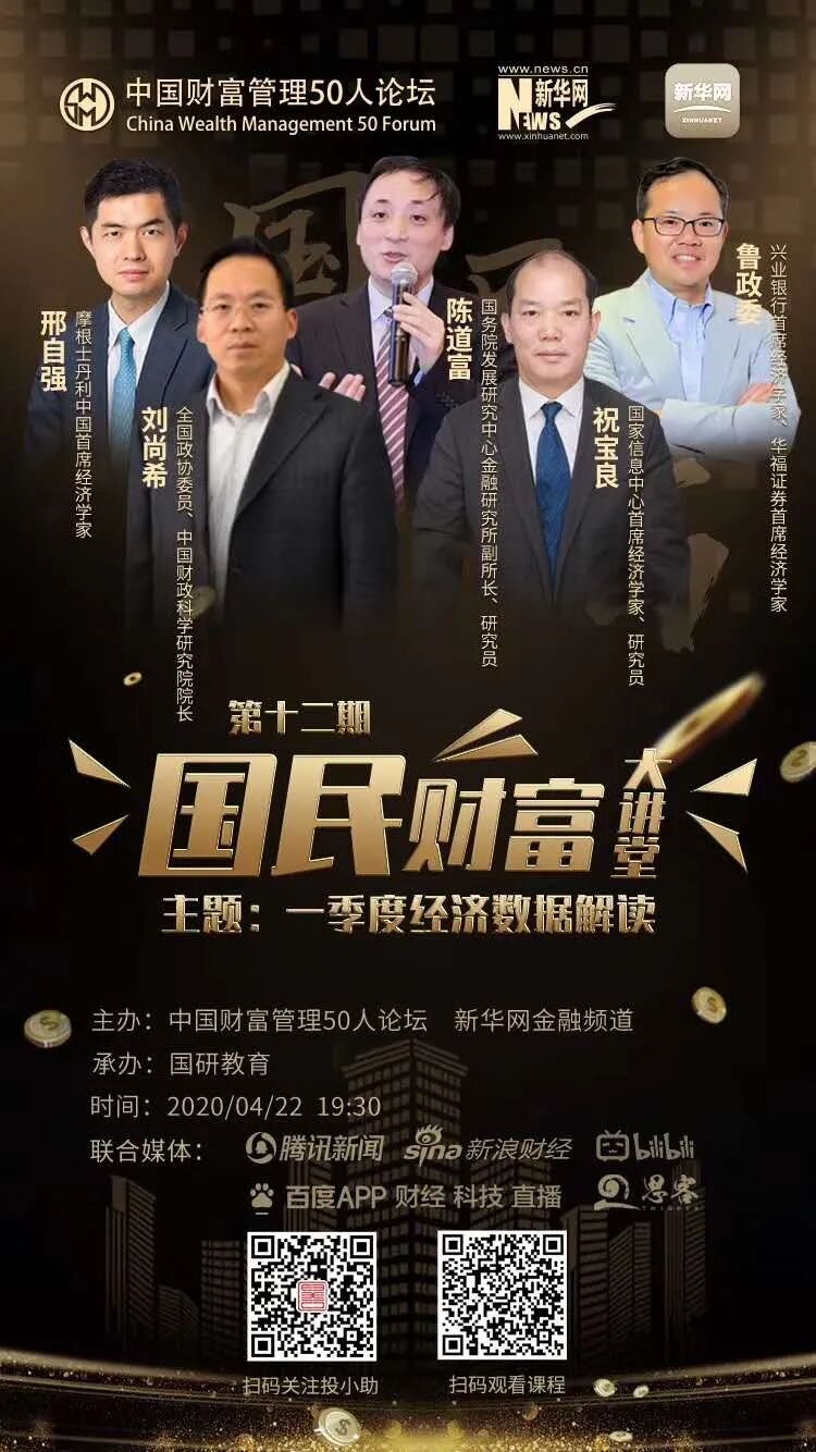 4月22日(周三)晚七点半,全国政协委员、中国财政科学研究院院长刘尚希,国家信息中心首席经济学家、研究员祝宝良,国务院发展研究中心金融研究所副所长、研究员陈道富, 摩根士丹利中国首席经济学家邢自强和兴业银行首席经济学家、华福证券首席经济学家鲁政委做客《国民财富大讲堂》第十二期节目。五位嘉宾将围绕“一季度经济数据解读”主题展开一场精彩的高峰对话。
