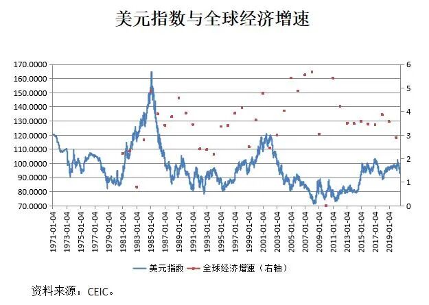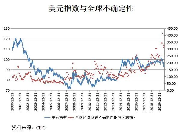 针对美元指数在下行中波动性很强的判断,主要基于美元的以下两个特征:第一个特征是避险货币。在全球动荡的时候,美元通常能保持坚挺。当前全球经济政策不确定性依然在高位,考虑到下半年美国大选、中美冲突、英国脱欧进程、俄罗斯北约的冲突,在未来一段时间,美元指数很难会有一个根本性的下降。