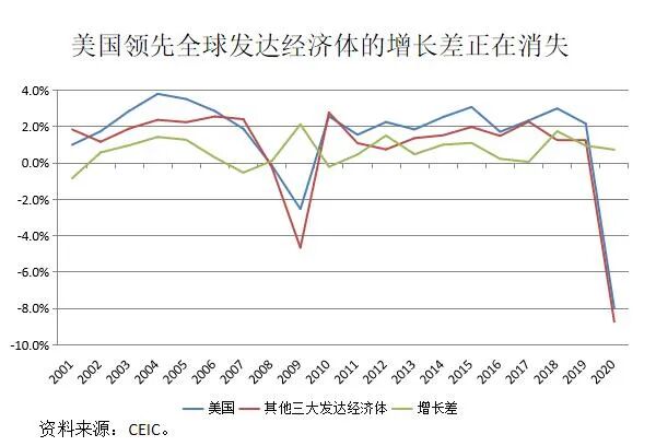 第二,2008年之后的绝大部分时间内,美国都保持着对其他发达经济体的正增长差,这是美元指数上升的重要原因。但是过去三年,这个正增长差正在快速消失,可能预示着美元指数的牛市即将终结。