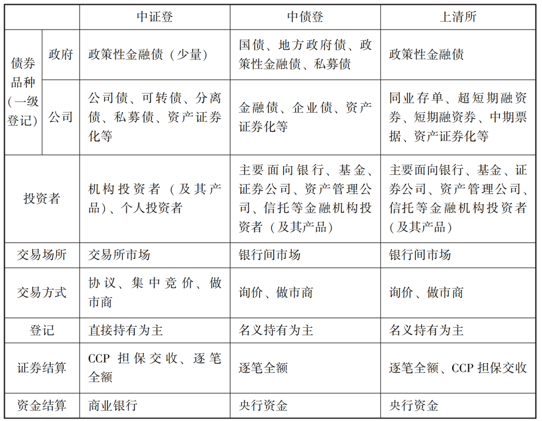 1.今日格局是历史发展的客观结果。1995年 “327国债事件” 后,负责国债统一登记托管结算的中债登成立,随后,人民银行于1997年要求商业银行全部退出交易所市场的债券回购及现券交易,成立主要面向合格机构投资者的银行间债券市场,并指定中债登作为该市场的债券登记存管和结算机构;2009 年,顺应场外衍生品集中登记清算的国际金融监管改革趋势,人民银行推动成立上海清算所,为利率、外汇及其衍生品等金融产品提供集中清算服务。