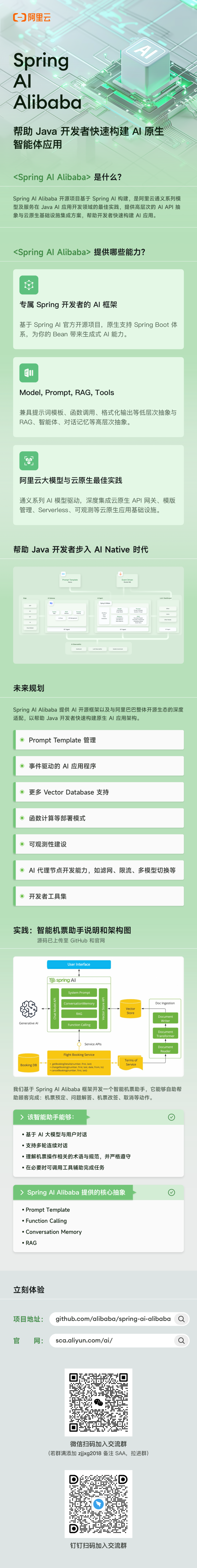 最后我们构建了 AI 行业专家解决方案,沉淀了 AIPaaS 的雏形,以模型未核心,Agent 驱动,充分挖掘私域数据,打造行业 AI 专家!未来,我们将提供 Spring AI Alibaba 和阿里巴巴整体开源生态的深度适配,包括 Prompt Template 管理、事件驱动的 AI 应用程序、更多 Vector Database 支持、函数计算等部署模式、可观测性建设、AI 代理节点开发能力,如绿网、限流、多模型切换和开发者工具集,旨在构建业内最完整的 AI 驱动的 Java 开发框架生态。