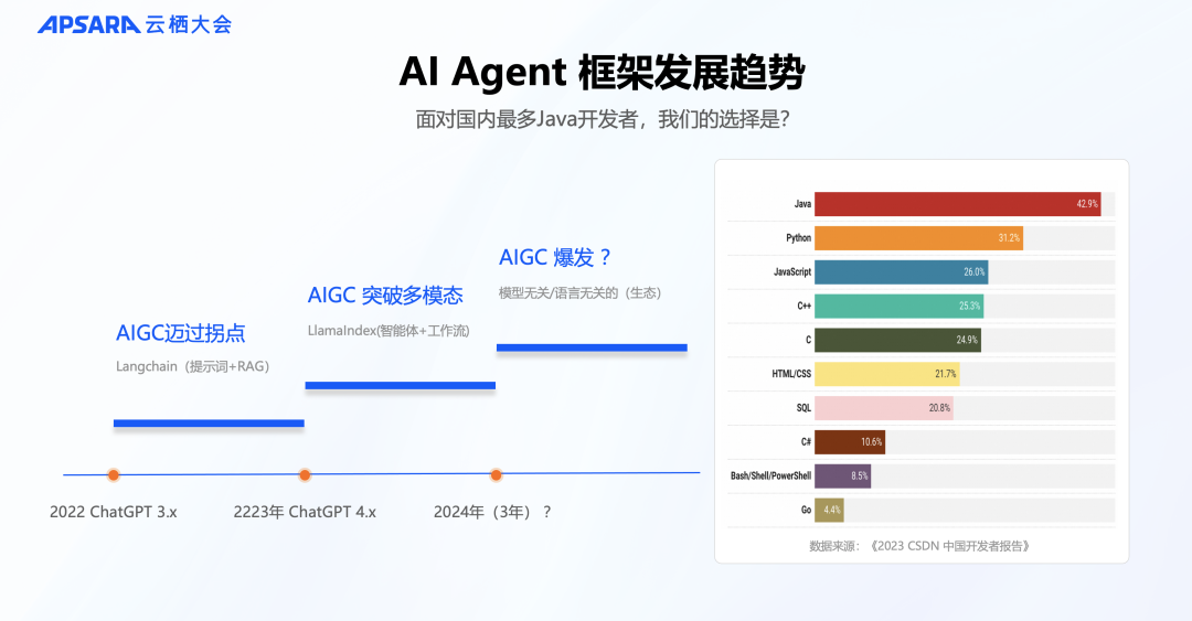 第三阶段:2024 年,随着多模态发展,模型能力持续突破,在过去的两年框架以 Python 为主,但是对于中国 42.9% 的 Java 开发者会选择是什么来构建 AI 应用呢?写 Python?写 Java 版 Langchain / LlamaIndex ?还是基于 Spring 体系进行构建?
