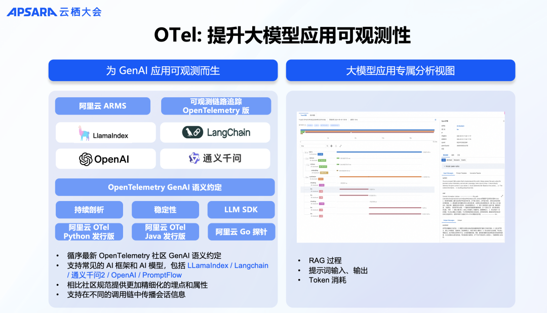 OTel:基于开源 Open Telemetry Python SDK 进行了扩展,发布可观测探针,为 GenAI 应用可观测而生,能自动获取大模型调用各个阶段的数据,全面提升 LLM 应用的可观测性。